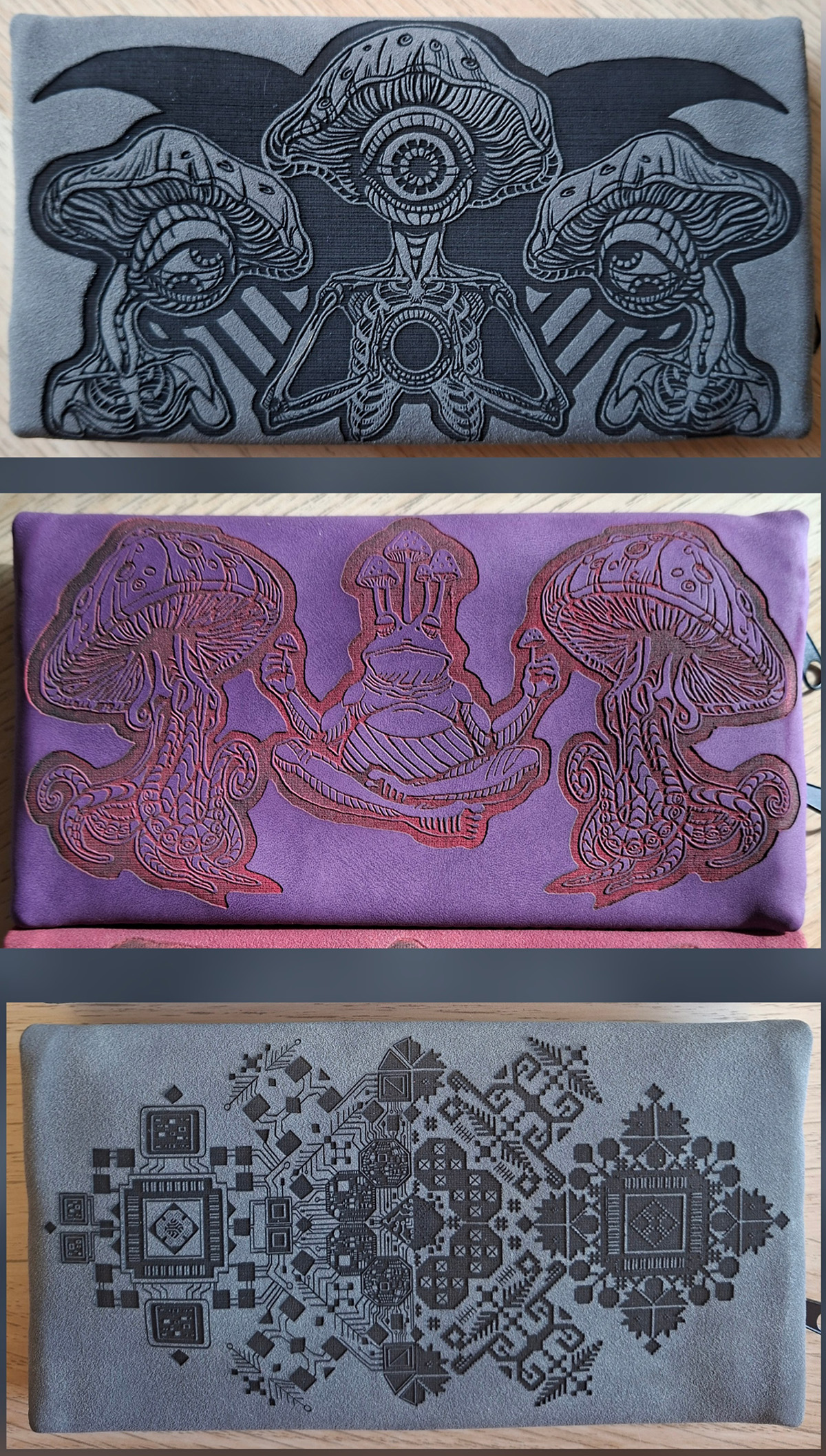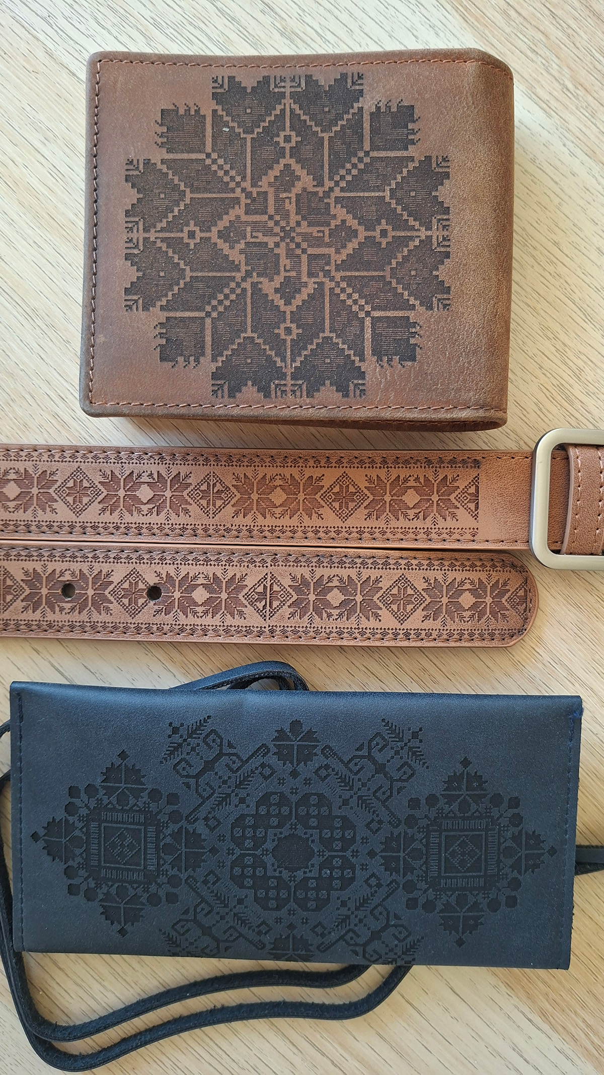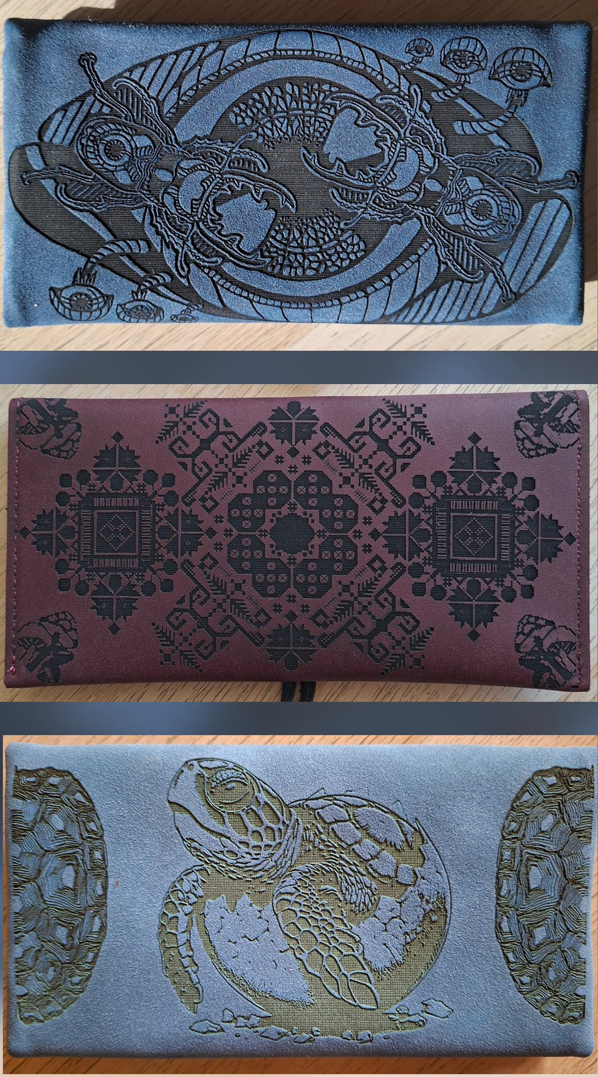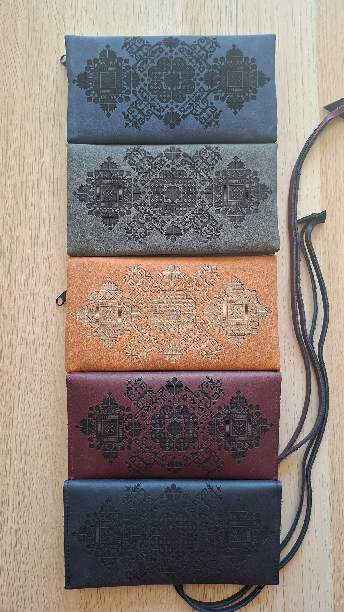 We offer art engraved leather materials such as pouches, belts, wallets and more.