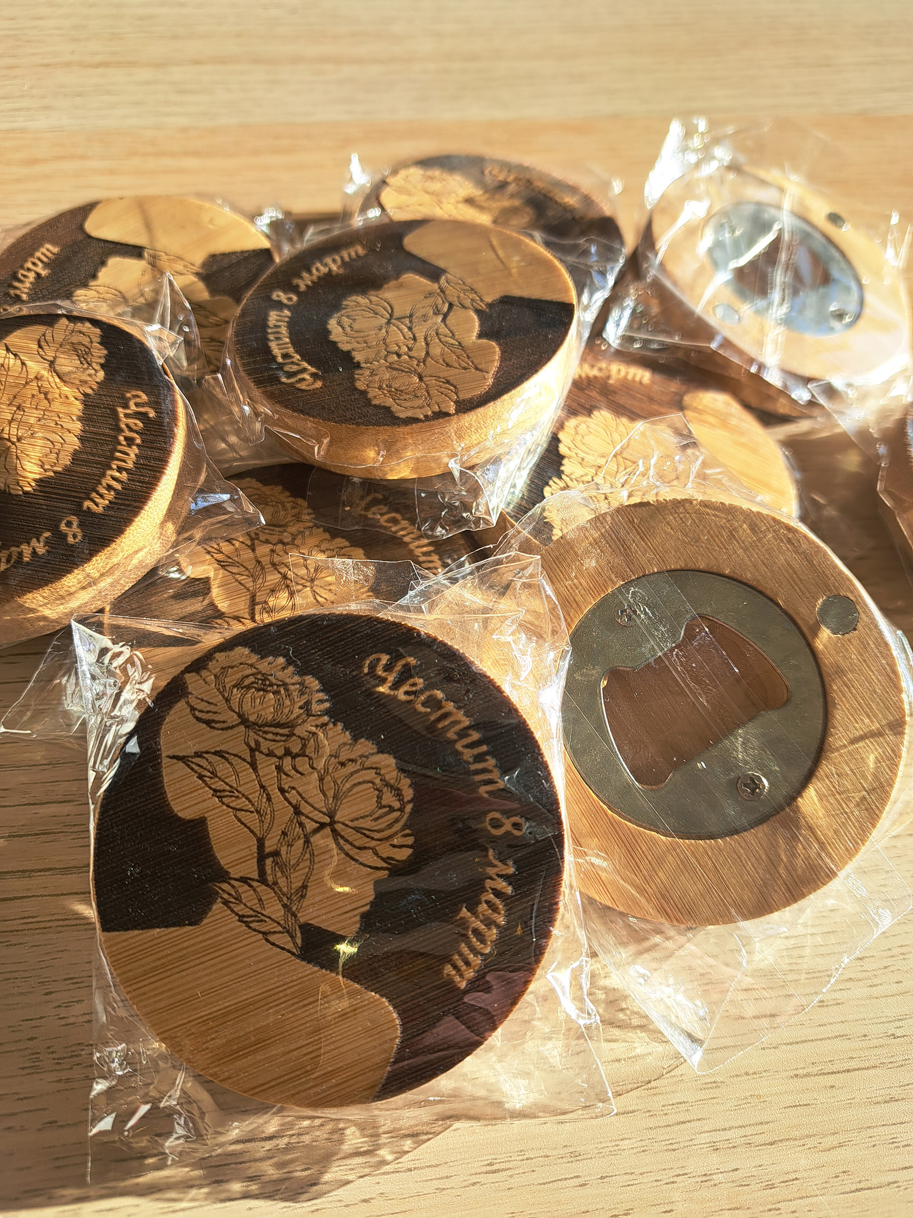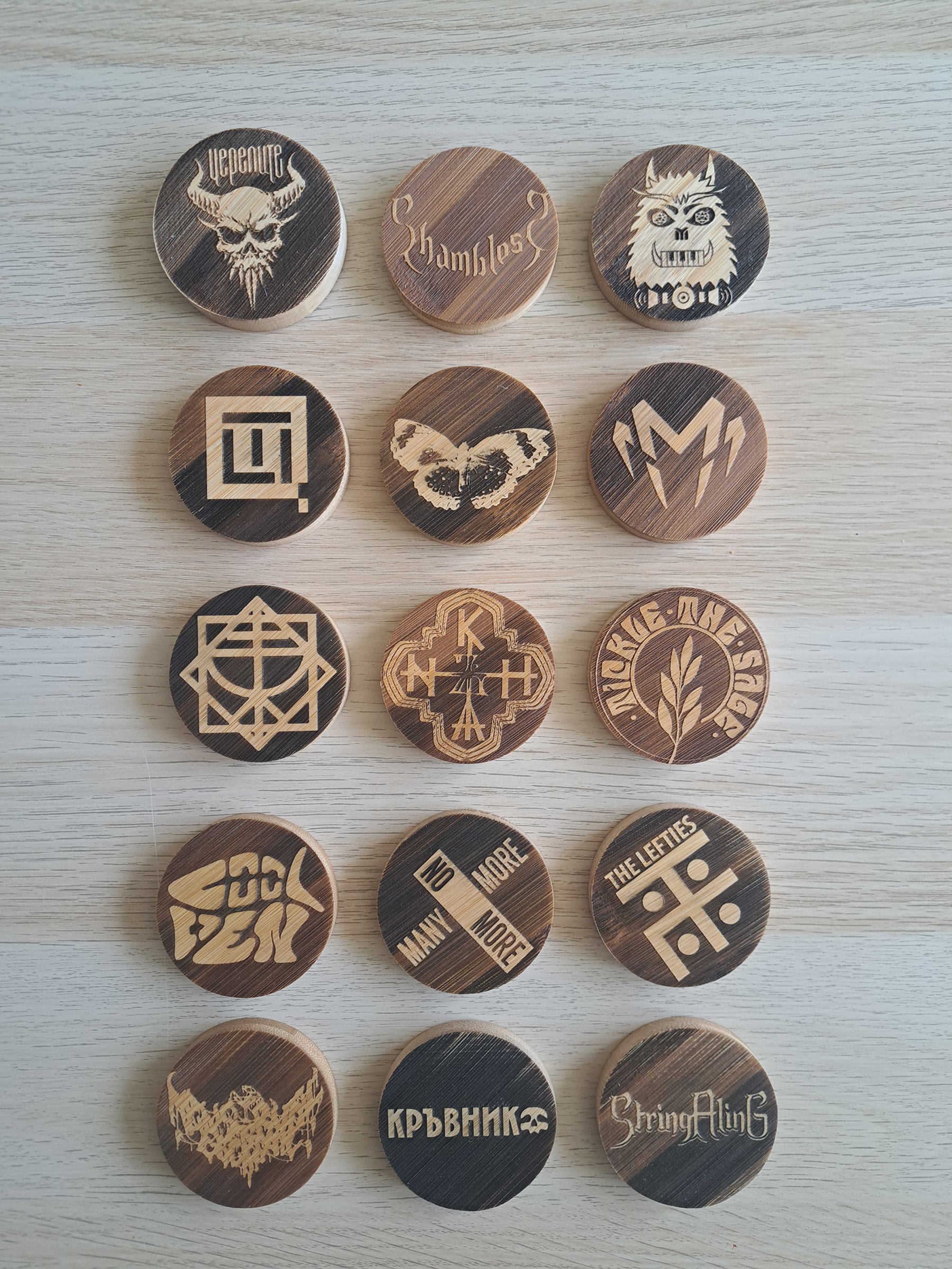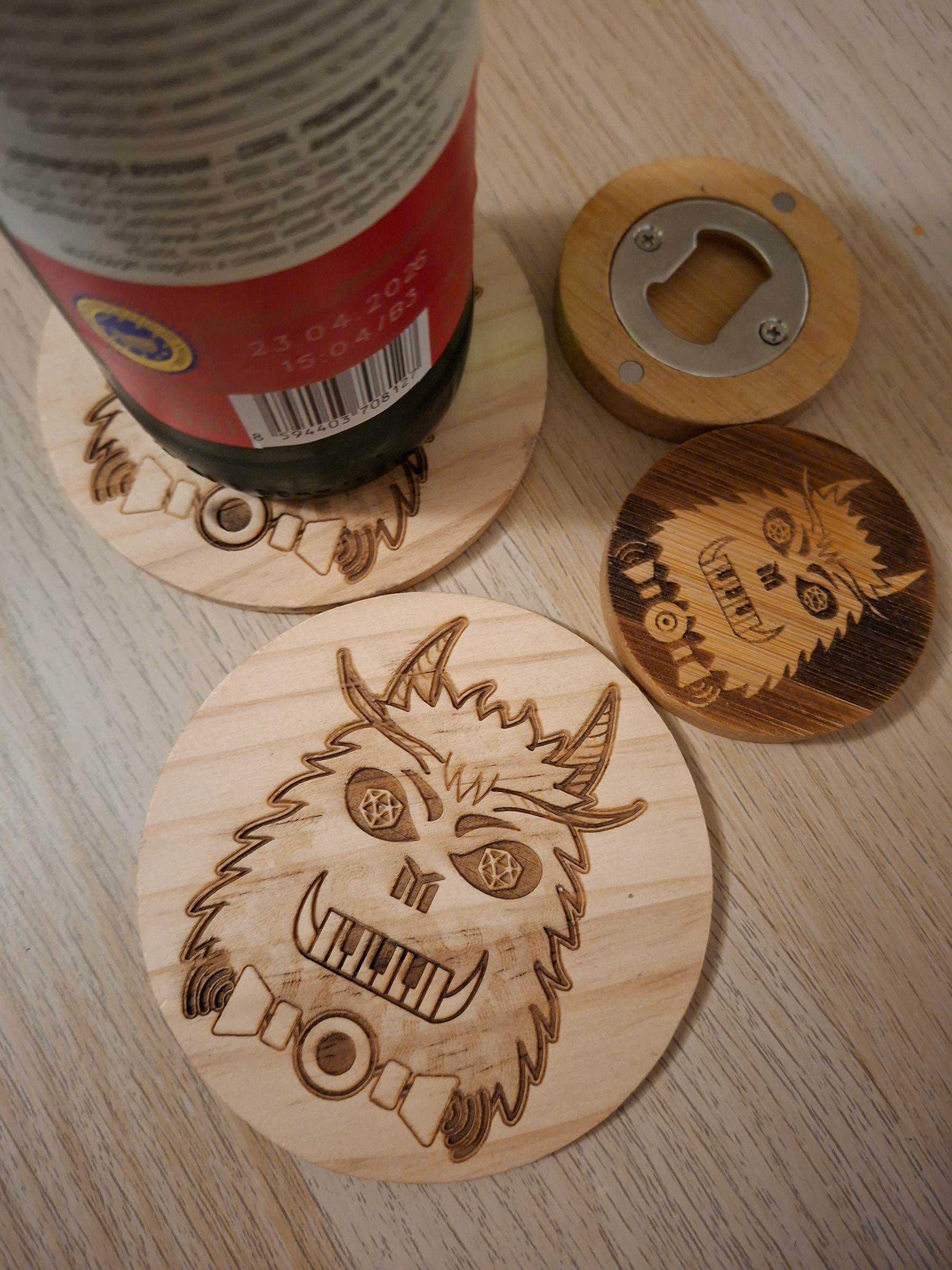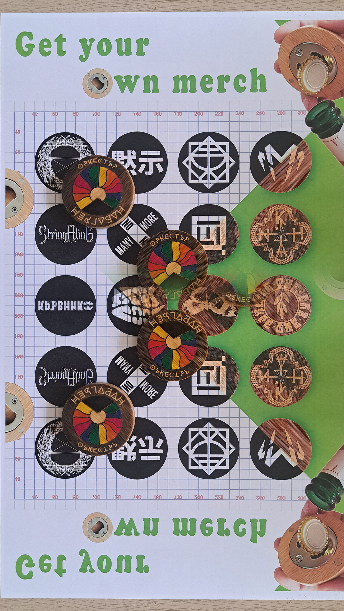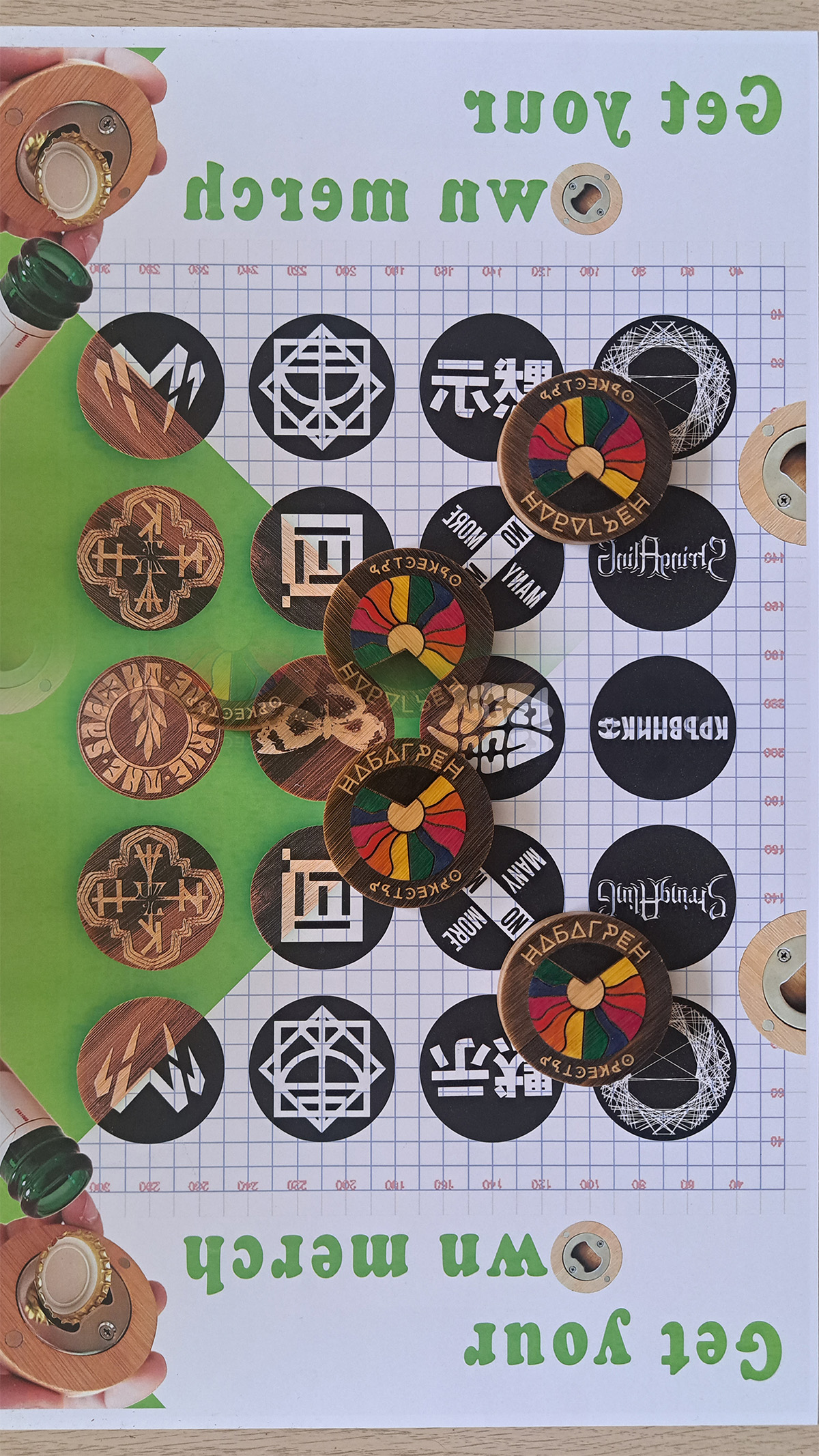 Examples are bottle openers with magnets, wooden tables, pouches, belts and many more.