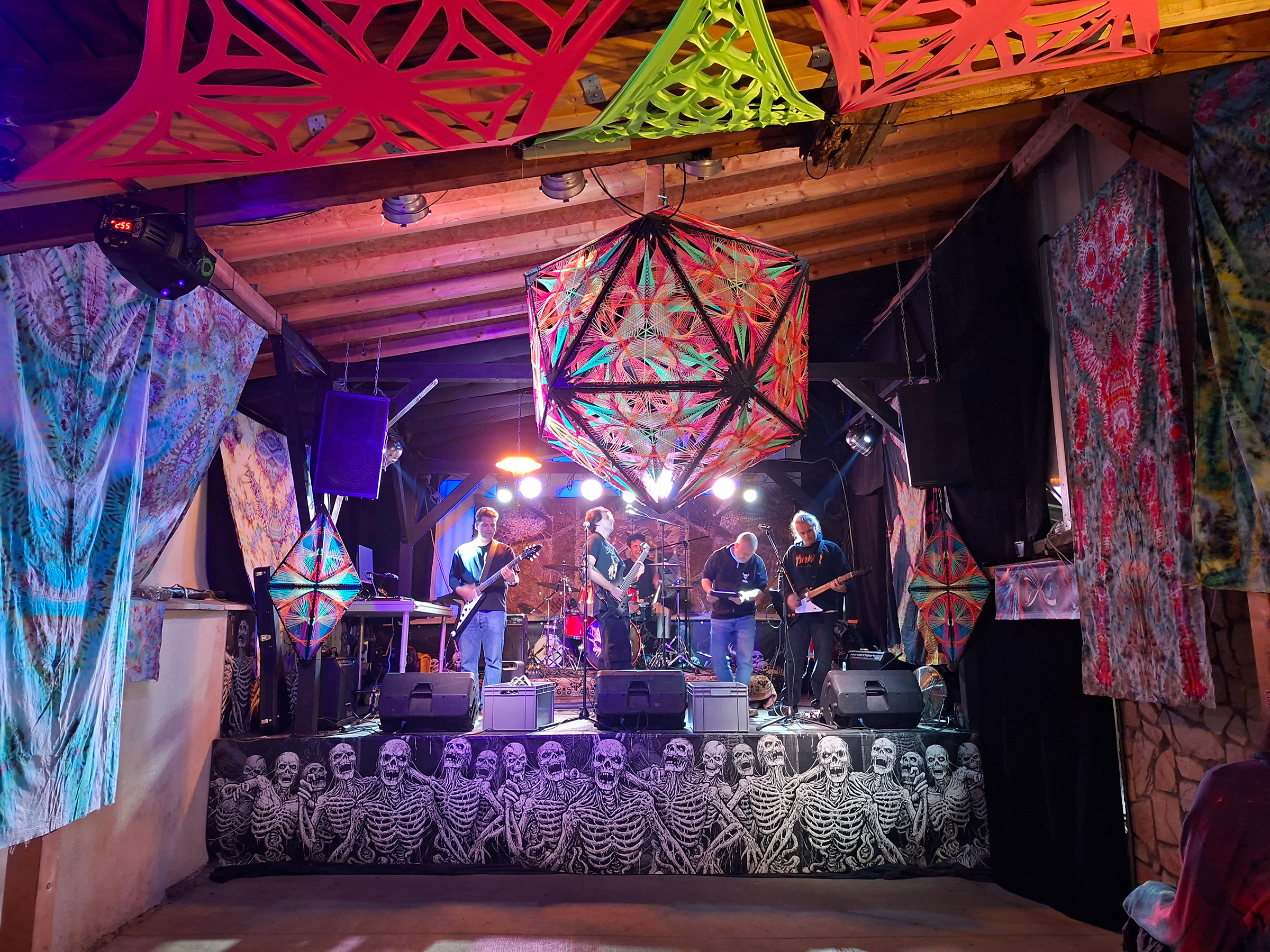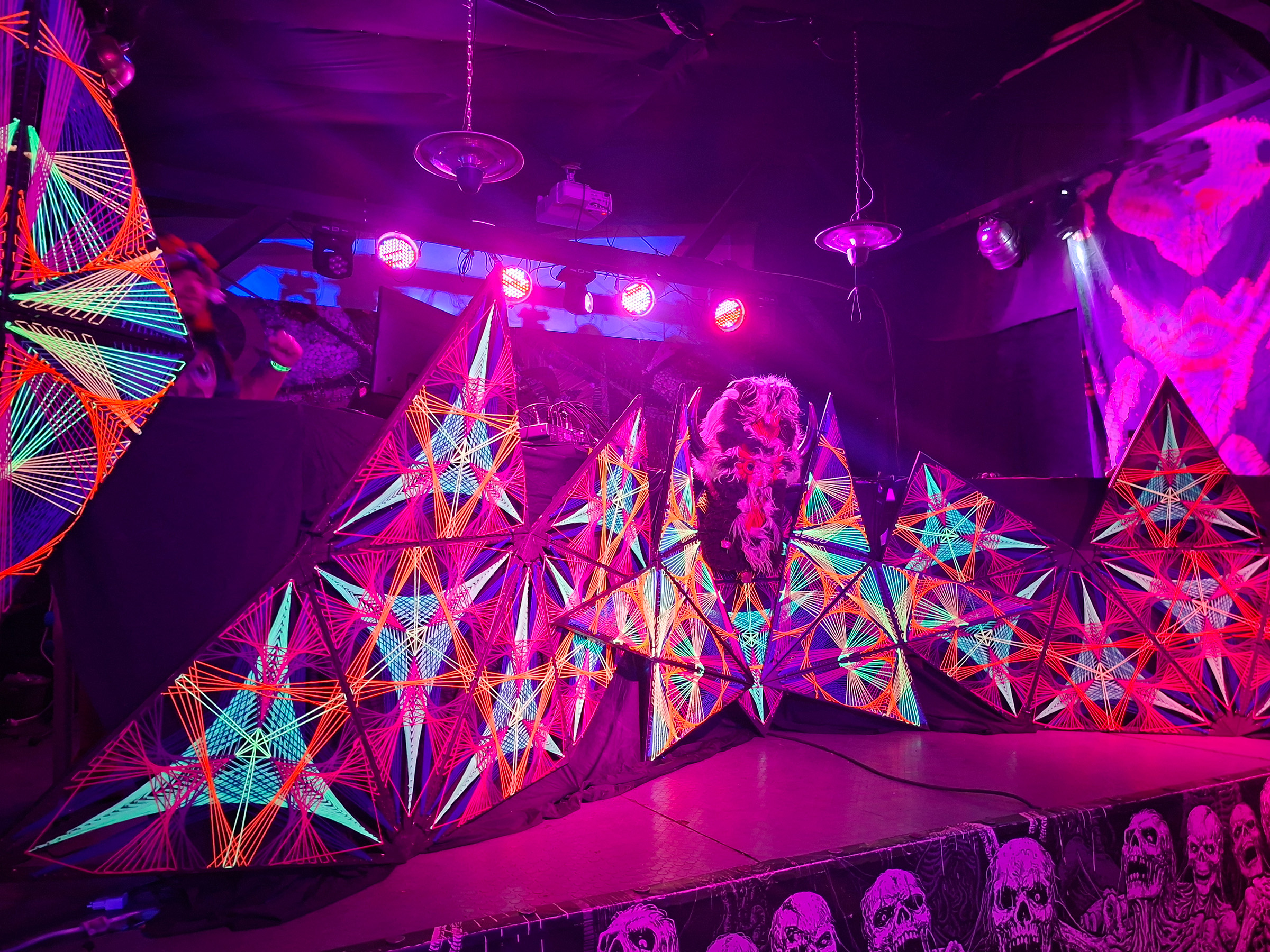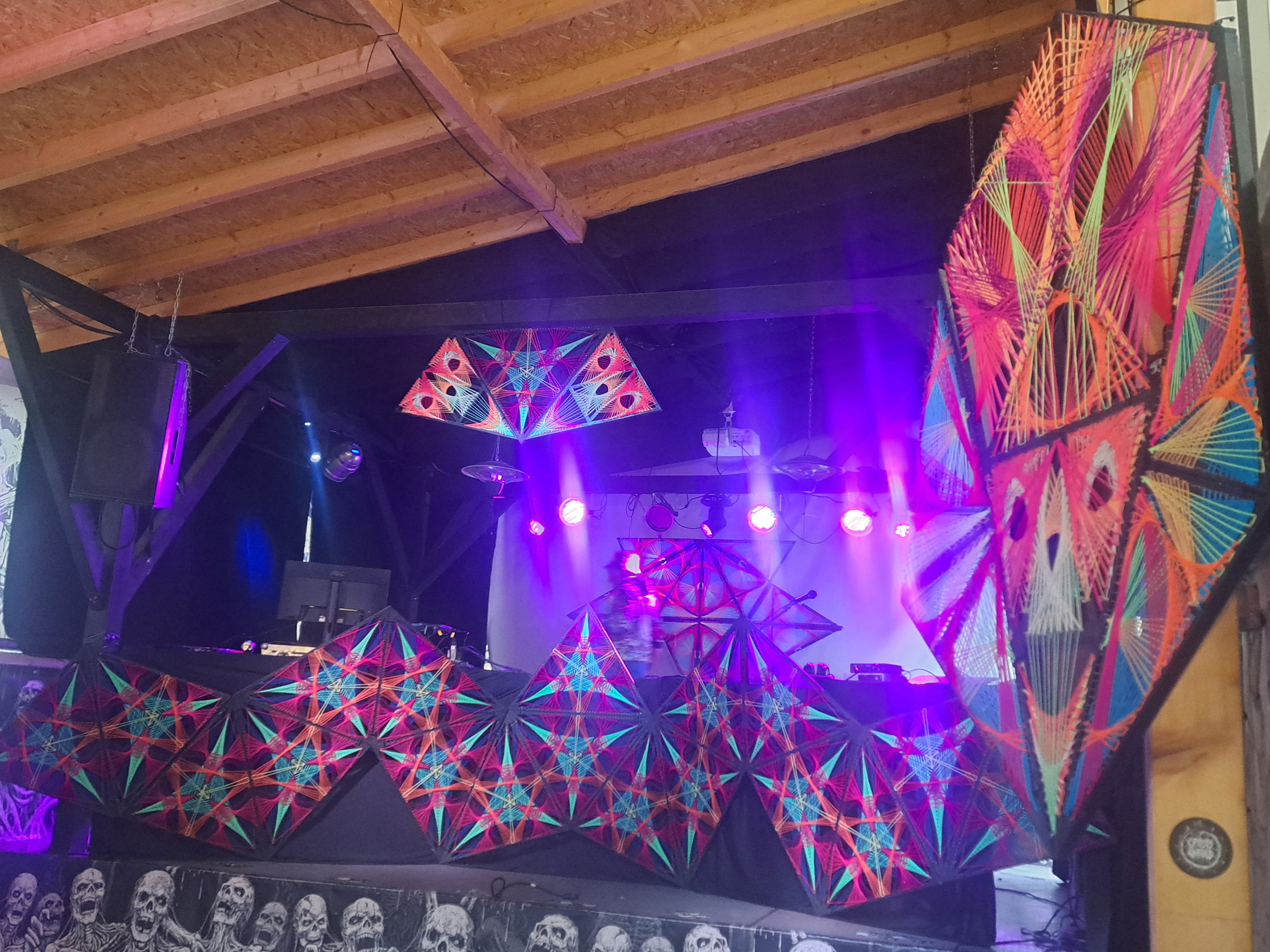 We made a flexible front stage covering with multiple string art patterns to make sure every band, dj, performer and shop have the perfect atmosphere.